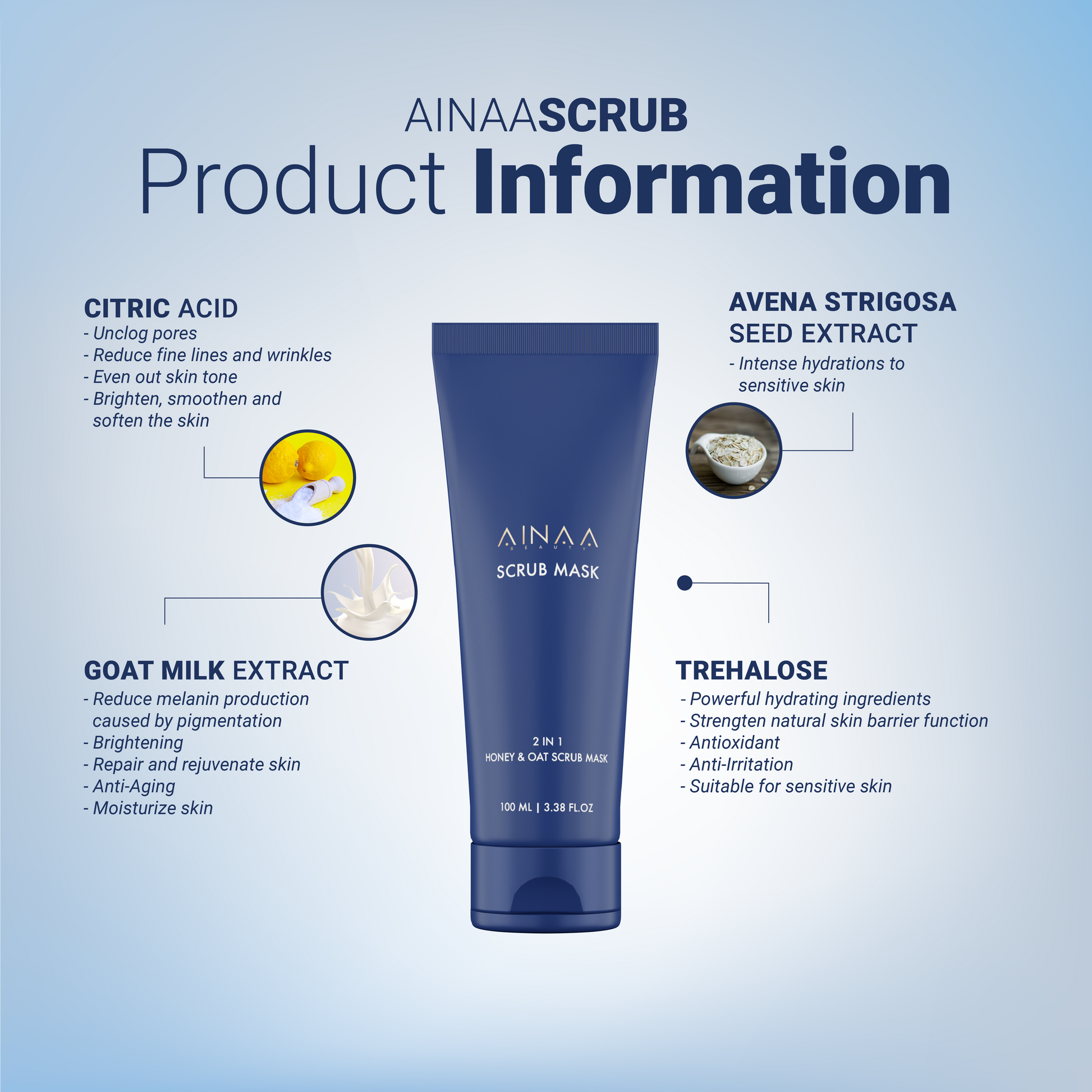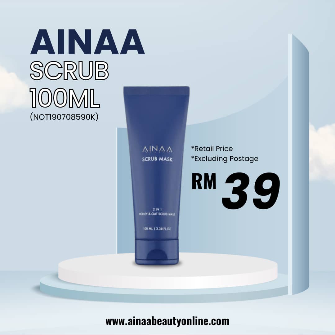 AINAA SCRUB & MASK ada fungsi 2 dalam 1. Ia boleh diguna sebagai scrub dan juga mask. Mengandungi bahan-bahan semulajadi iaitu avena strigosa seed extract, goat milk extract dan honey extract. Fungsi scrub mampu menanggalkan kulit mati manakala fungsi mask mampu melembapkan kulit secara semulajadi.