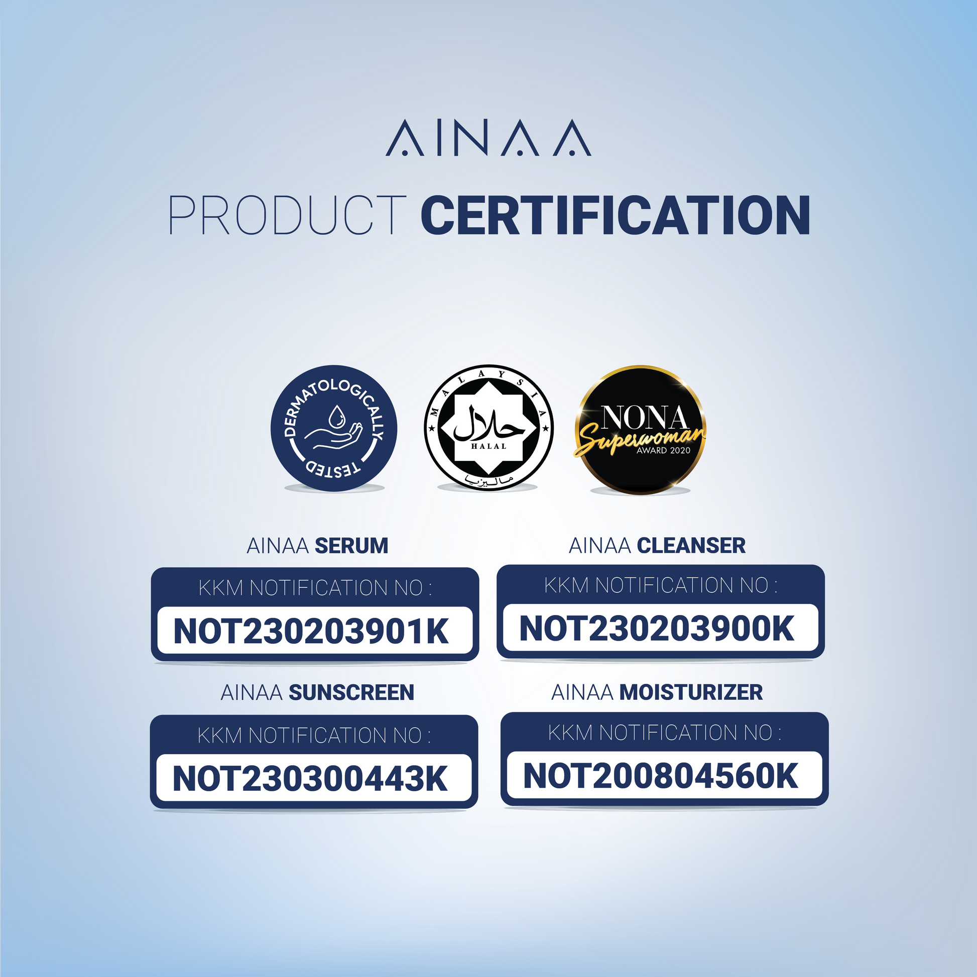 Dalam set ini ada AINAA Serum, Cleanser, Moisturizer dan Sunscreen.